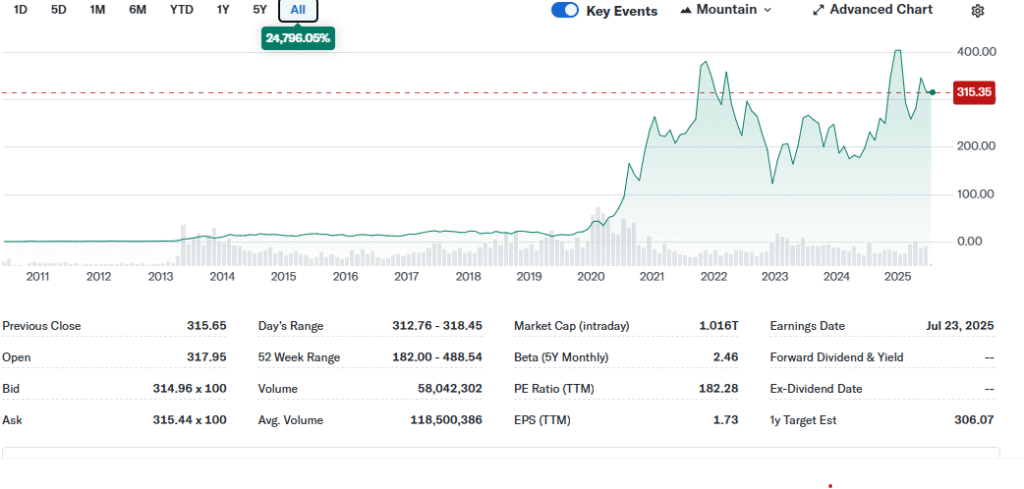 - 2025년 7월 현재 주가: $315.35(약 43만원), 연초 대비 16.9% 하락.